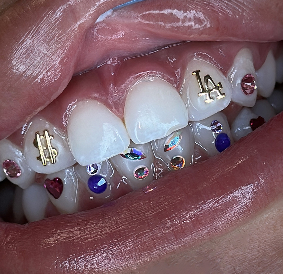 Tooth gems are small decorative crystals or real gold applied to the enamel surface to your teeth. They are professional applied with orthodontic grade materials. We offer a wide selections of real genuine swarovski crystals and 18k gold charms of your choice in every color, shape, size and design.